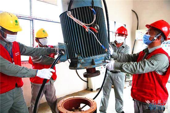原200千伏安的變壓器被吊下配變臺架,新調來(lái)的315千伏安的變壓器平穩地落座在配變臺架上……通過(guò)近4個(gè)小時(shí)的安裝、調試,接通10千伏千畝湖支線(xiàn)等一系列的緊張作業(yè)。19時(shí)02分,2臺先期安裝好的55千瓦的水泵成功發(fā)起,兩股水流沖出千畝湖,流向遠方。