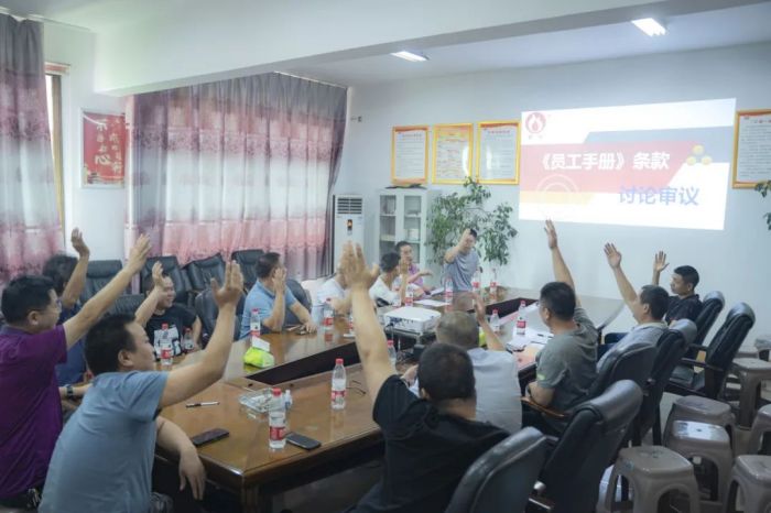 會(huì )議環(huán)節,安環(huán)委主任通篇朗讀新版《員工手冊》安全管理條款,公司各部門(mén)中層及以上管理人員共同討論審議,舉手表決,全票通過(guò)。新版《員工手冊》將于2023年7月在朝陽(yáng)集團正式啟用執行。